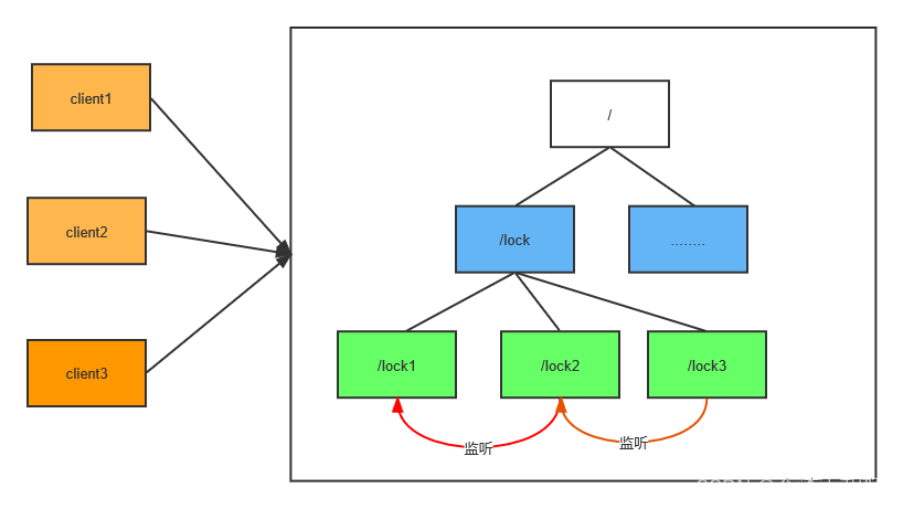 3.如果发现自己创建的节点并非Lock所有子节点中最小的,说明此时该客户端还没有获取到锁,此时客户端需要找到比自己小的那个节点,同时对其注册监听器,监听删除事件。