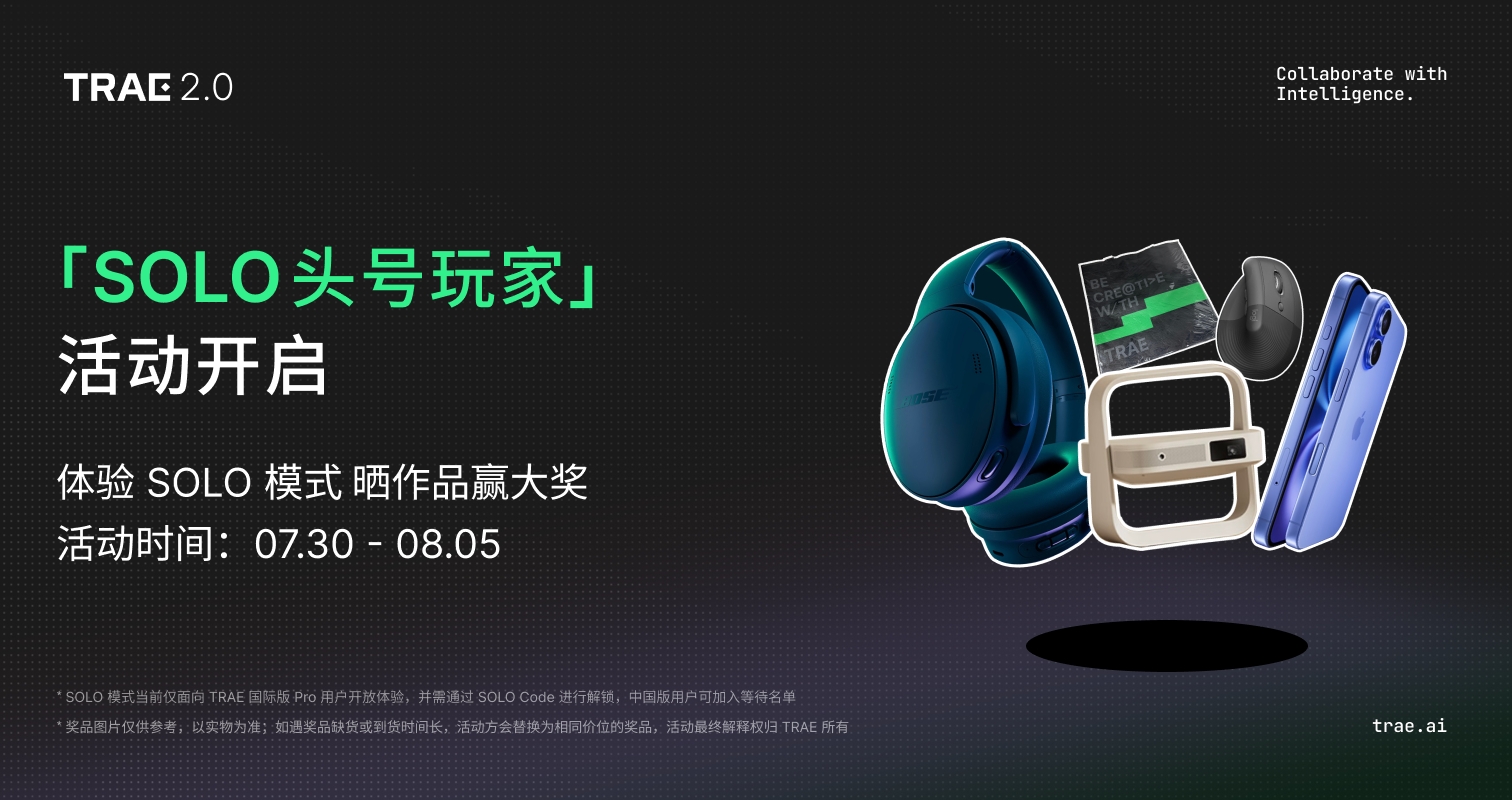 本次活动仅面向 TRAE SOLO 用户;还未能获得 SOLO Code 的朋友可以前往 TRAE 国际版官网 trae.ai 点击「Get SOLO Code」继续填写 waitlist,我们在持续协调资源逐步发放