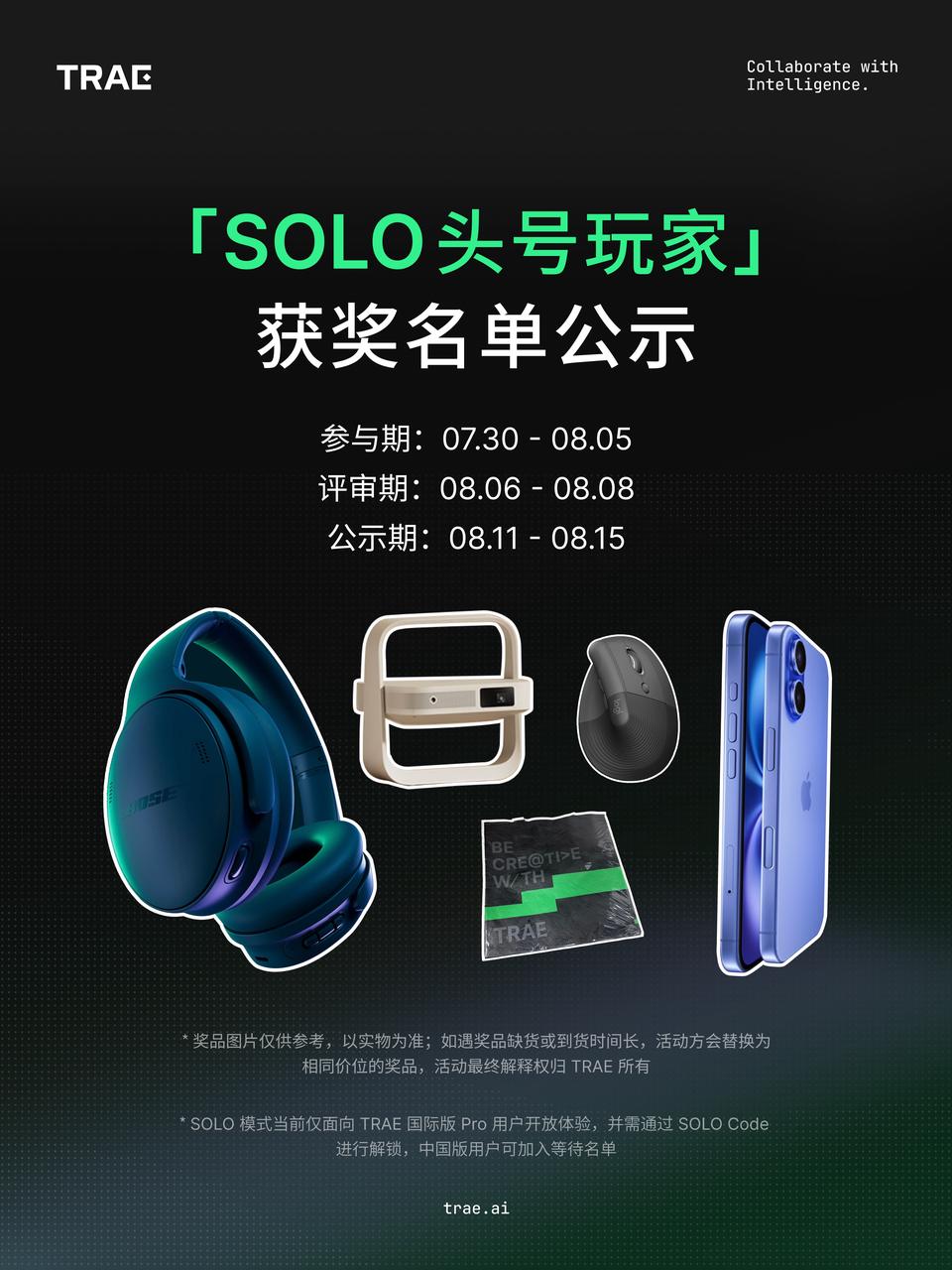 感谢大家对「SOLO 头号玩家」活动的热情!在过去为期 1 周的活动参与期内,许多用户在各平台积极晒出自己用 SOLO 做的项目,也有不少参与者深度展示了开发实践过程,形成了自己的使用案例,并传播给了更多的人。