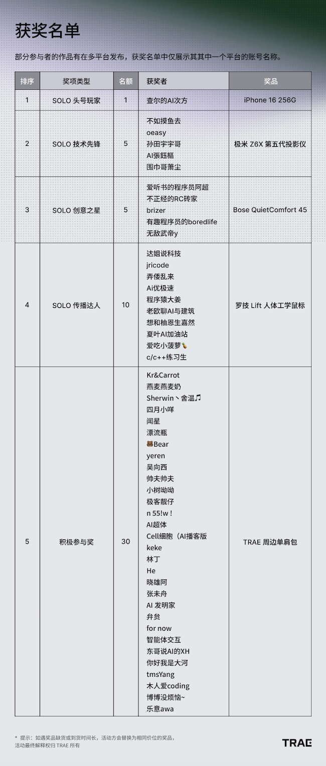 恭喜以上获奖者!TRAE 官号将于本周内私信获取收货信息,请各位获奖者注意查看自己作品发布平台的私信,以便奖品的顺利发放。