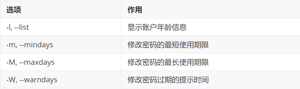 语法:chage [选项] [用户名]