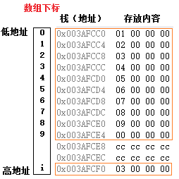 所以最好将局部变量i定义在数组的下方,使得i的地址存在于低地址处,而数组元素的地址再增加也不会越界访问到i的地址,不会产生死循环。