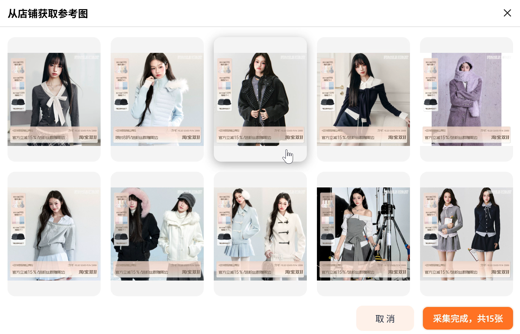 我们结合实际操作场景,结合用户痛点进行了优化,比如我们推出了参考图智能推荐。过去卖家需在多级分类中翻找参考,有时候耗时十几分钟;现在上传商品(如复古碎花裙),系统自动识别色彩、款式、风格进行推荐,找参考图仅需2分钟。再比如我们新增了店铺参考图智能采集,此前手动下载对标店铺素材比较繁琐,还易漏图。现在输入店铺链接,可一键采集所有视觉素材,效率提升10倍。