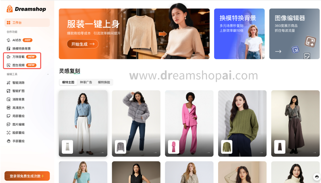 但现在,情况正在发生根本性改变。近期完成重要升级的Dreamshop AI,通过三大核心功能——AI试衣、万饰穿戴与图生视频——构建了一套覆盖从静态展示到动态营销的完整视觉解决方案。