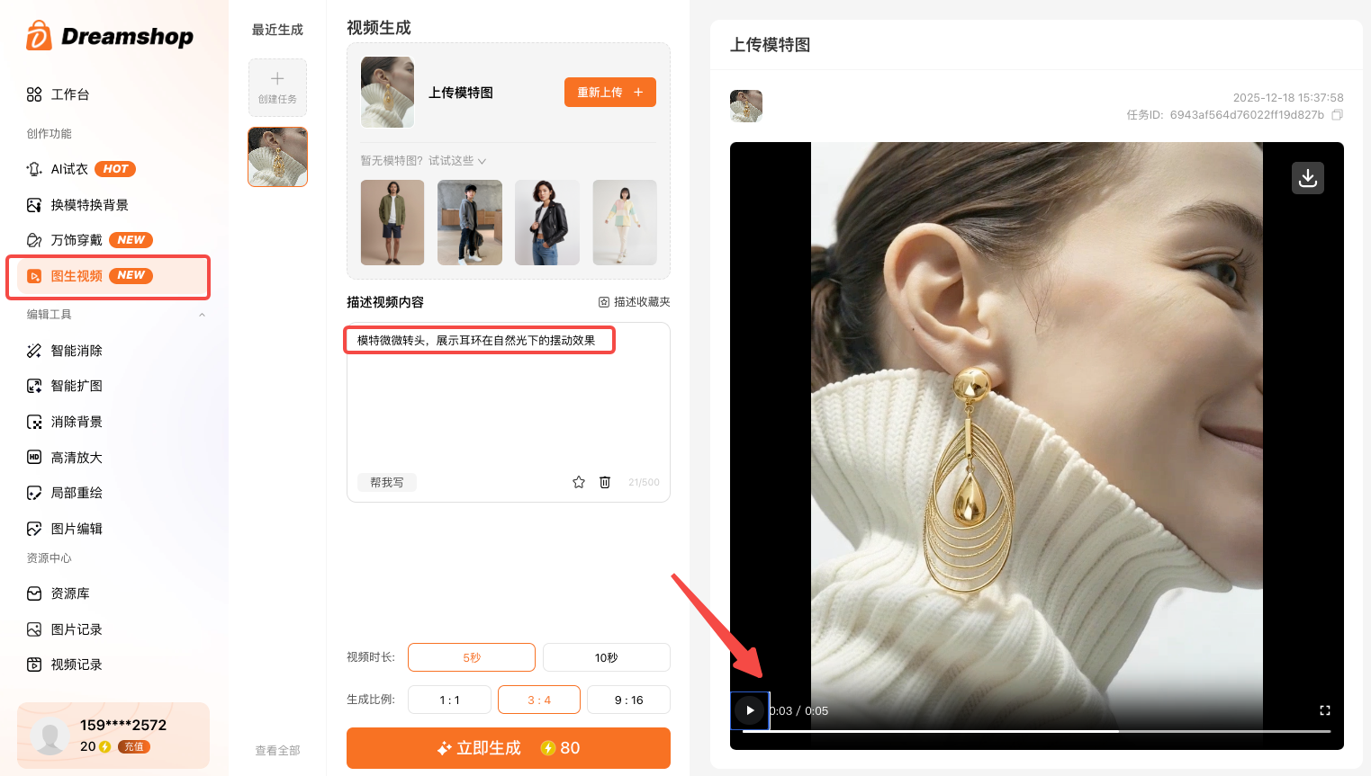 Dreamshop 的 “图生视频” 功能正是为了解决这一难题而生。它允许用户将任意高质量的静态商品图转化为动态视频内容,打通了从“展示”到“叙事”的最后一环。