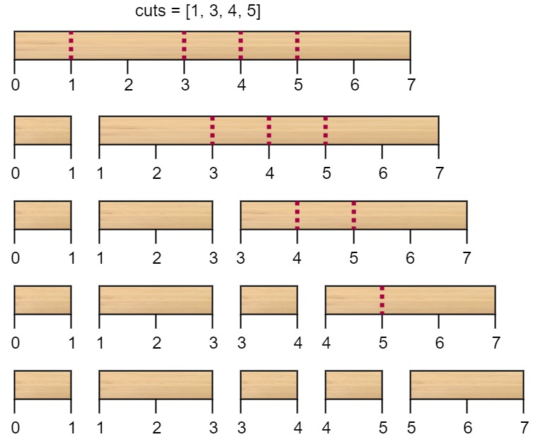 输入:n = 7, cuts = [1,3,4,5] 输出:16 解释:按 [1, 3, 4, 5] 的顺序切割的情况如下所示: