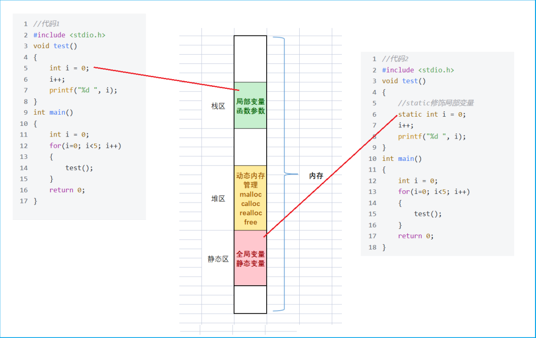 static修饰局部变量改变了变量的生命周期,生命周期改变的本质是改变了变量的存储类型,本来一个局部变量是存储在内存的栈区的,但是被 static 修饰后存储到了静态区。存储在静态区的变量和全局变量是一样的,生命周期就和程序的生命周期一样了,只有程序结束,变量才销毁,内存才回收。但是作用域不变的。