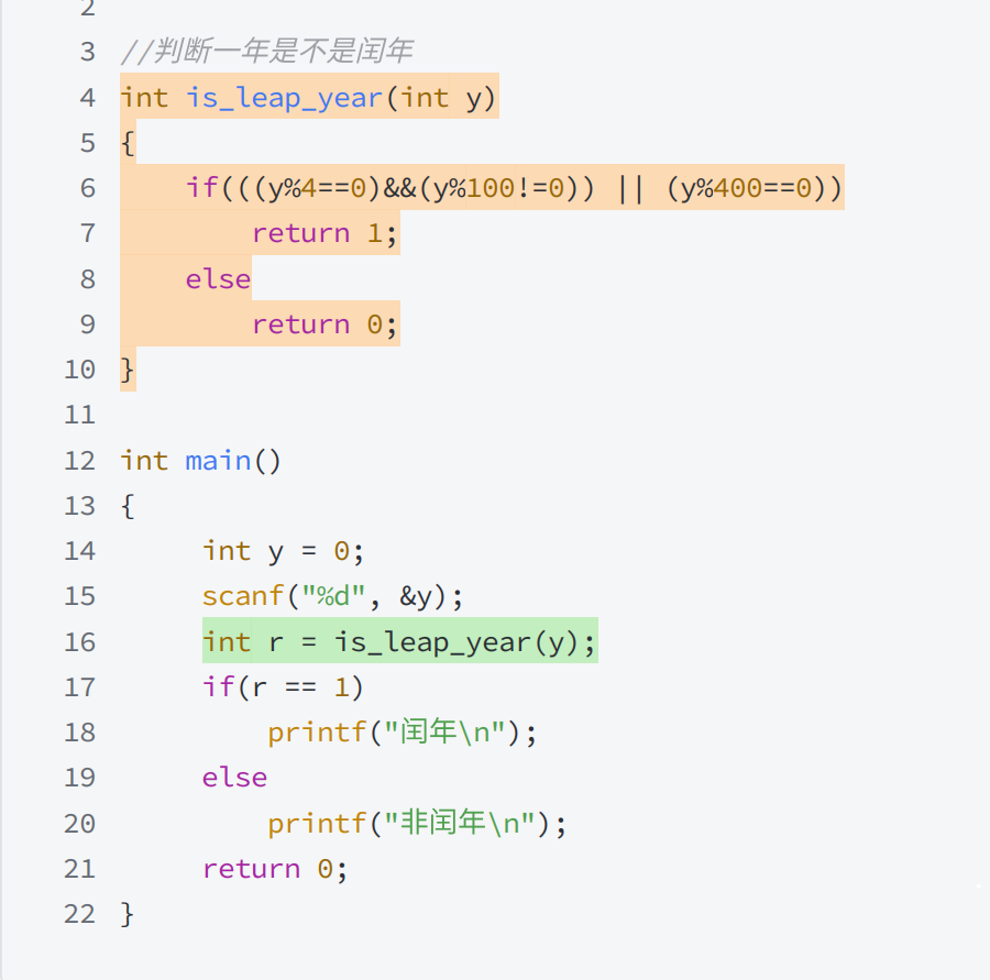 把怎么解决这个问题呢?就是函数调用之前先声明一下is_leap_year这个函数,声明函数只要交代