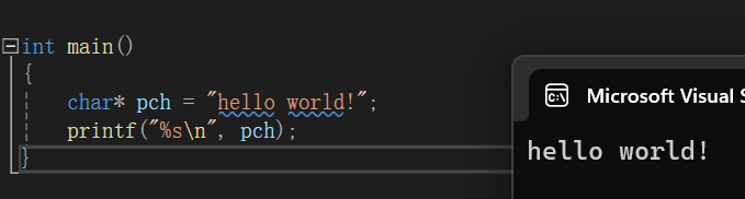 这里我们调试就可以发现代码是把hello world!首字符的地址放到了pch中。特别容易让同学以为是把字符串hello world!放到字符指针pch里了。
