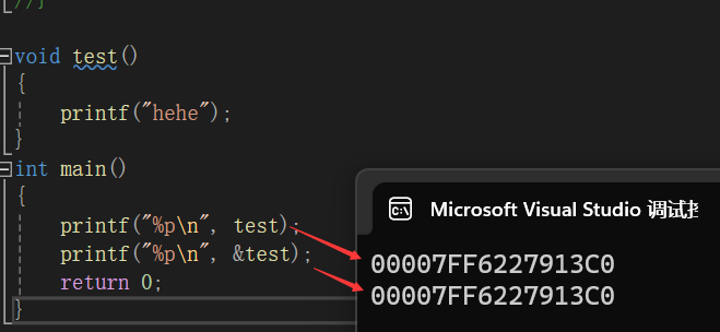 确实打印出来了地址,所以函数是有地址的,函数名就是函数的地址,当然也可以通过&函数名的方式获得函数的地址。
