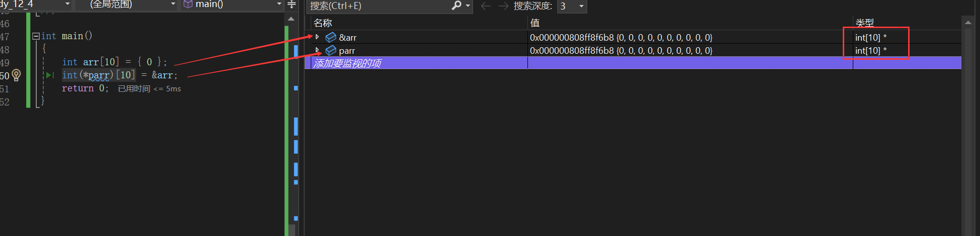 我们调试也能看到&arr和parr的类型是完全一致的。
