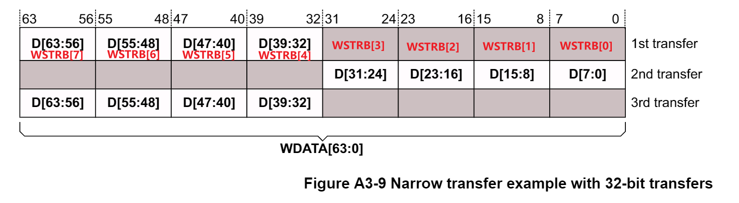 窄传输就是通过 STRB 信号指定有效传输数据的位宽来实现。针对一些特定的寄存器读写,或者在不同数据位宽的总线传输中会使用窄传输操作。如图,第一次传输时,WSTRB 信号为 0x01,WSTRB = b’001,表示 WDATA[7:0] 数据有效。