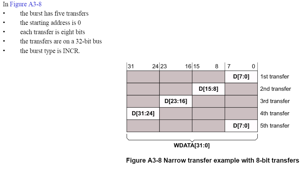 当本次传输中数据位宽小于通道本身的数据位宽时,称为窄位宽数据传输,或者直接翻译成窄传输。如下图,传输总线为 32bit,但是每次只传了 8 bit。