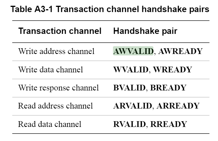 - 在置高 AWVALID 或 WVALID 之前,Master 不得等待 Slave 置高 AWREADY 或 WREADY