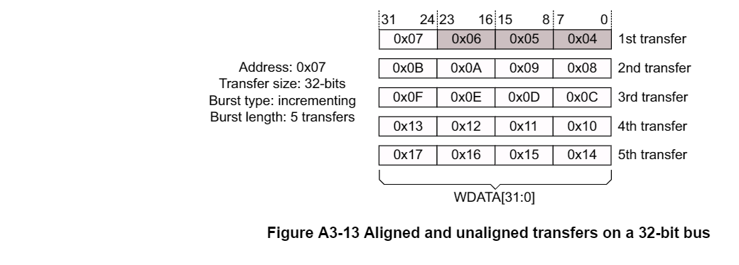 图四也为非对齐传输,起始地址为 0x07。对应的 WSTRB = b’1000。