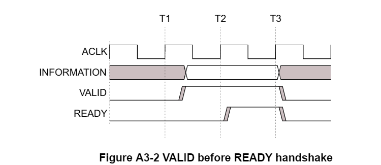 发送方 VALID 信号早早就到了,但是接收方的 READY 信号在 T2 之前都没有发送。可能接收方在接收其他数据,或者被堵在数据通路上。