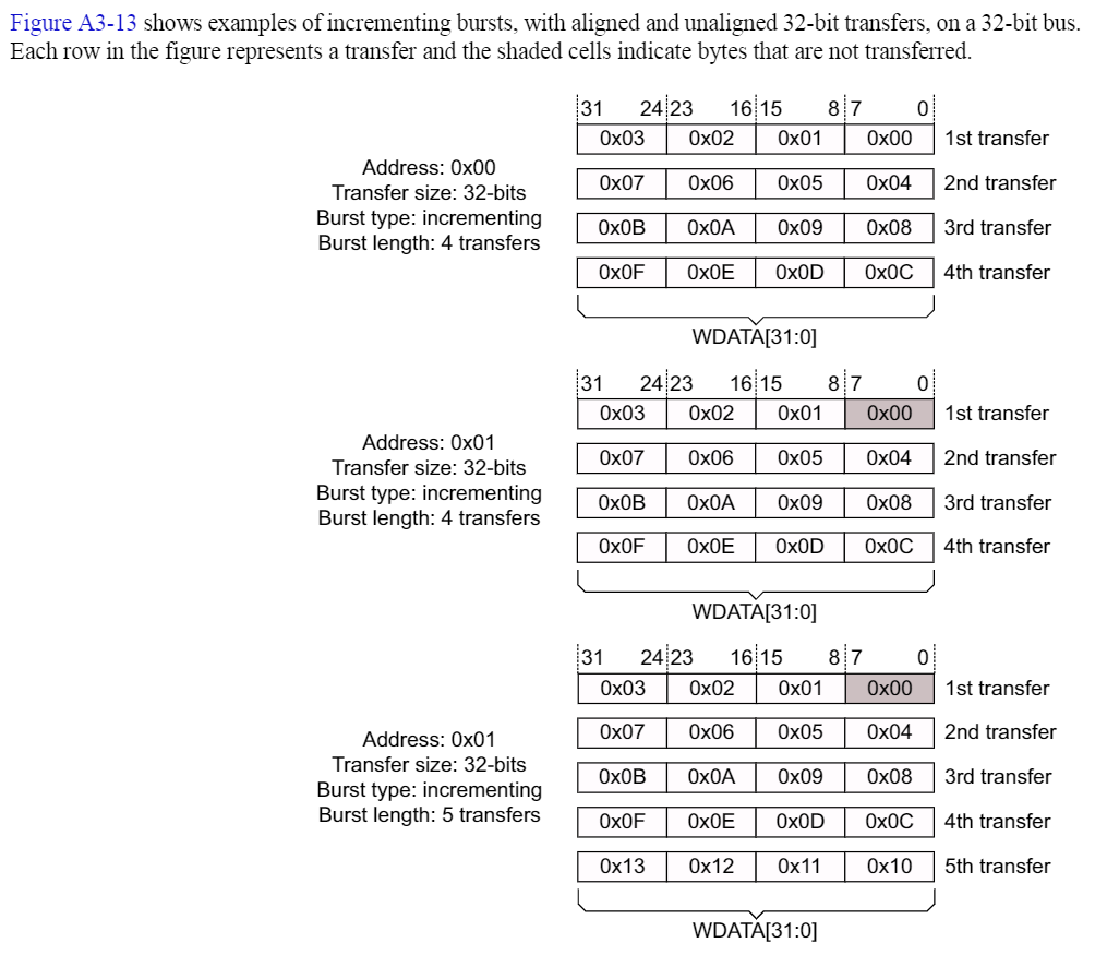 图二为非对齐传输,起始地址为 0x01,第一个格子对应的 WSTRB = b’1110。