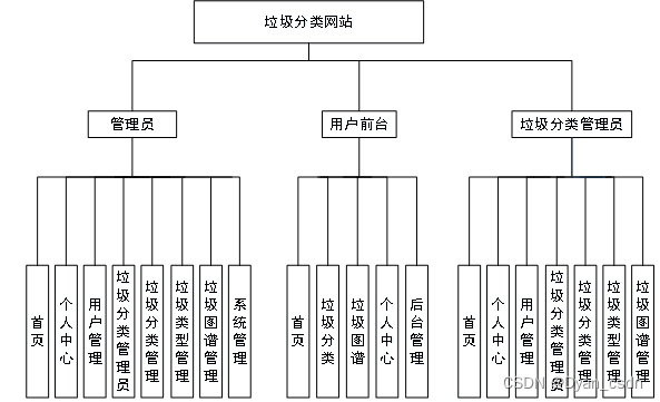 垃圾分类网站的主要使用者分为管理员和用户、垃圾分类管理员,实现功能包括管理员:首页、个人中心、用户管理、垃圾分类管理员管理、垃圾分类管理、垃圾类型管理、垃圾图谱管理、系统管理,垃圾分类管理员;首页、个人中心、用户管理、垃圾分类管理员管理、垃圾分类管理、垃圾类型管理、垃圾图谱管理,用户前台;首页、垃圾分类、垃圾图谱、个人中心、后台管理等功能。