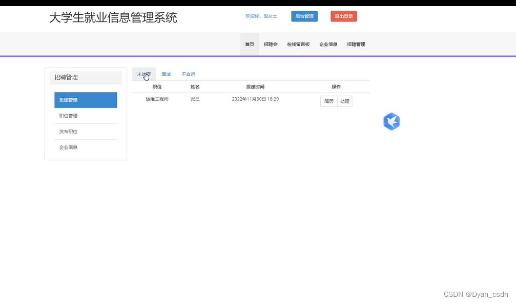 系统简介:大学生就来信息管理系统的功能主要是通过不同角色来进行区分的,主要分为用户和管理员两种角色。管理员的功能包括:权限认证、职位管理、企业管理、留言管理、用户管理、投递管理;用户的功能包括:首页、招聘会、留言板、个人信息。