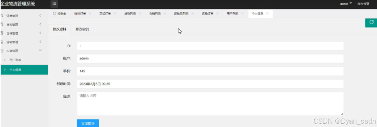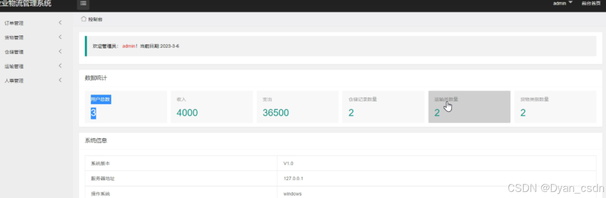系统简介:系统分为(1)前台(用户注册与登录);(2)后台(汇总了基本的每日数据情况包括用户数,收入支出等基本内容);(3)货物管理模块;(4)仓储管理模块;(5)运输管理模块(6)人事管理模块等。