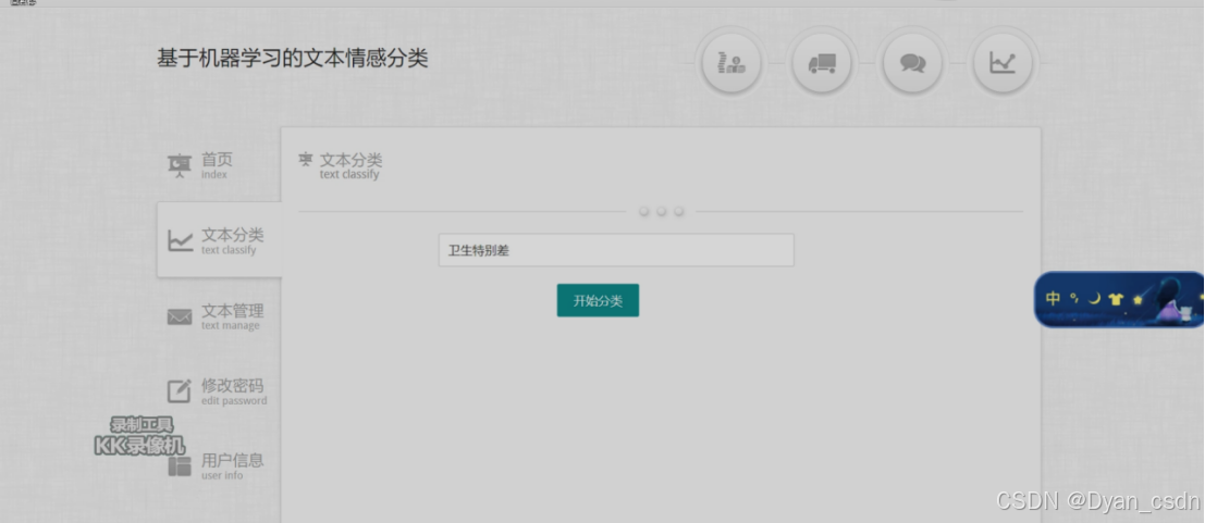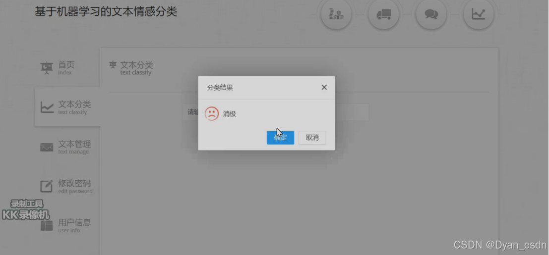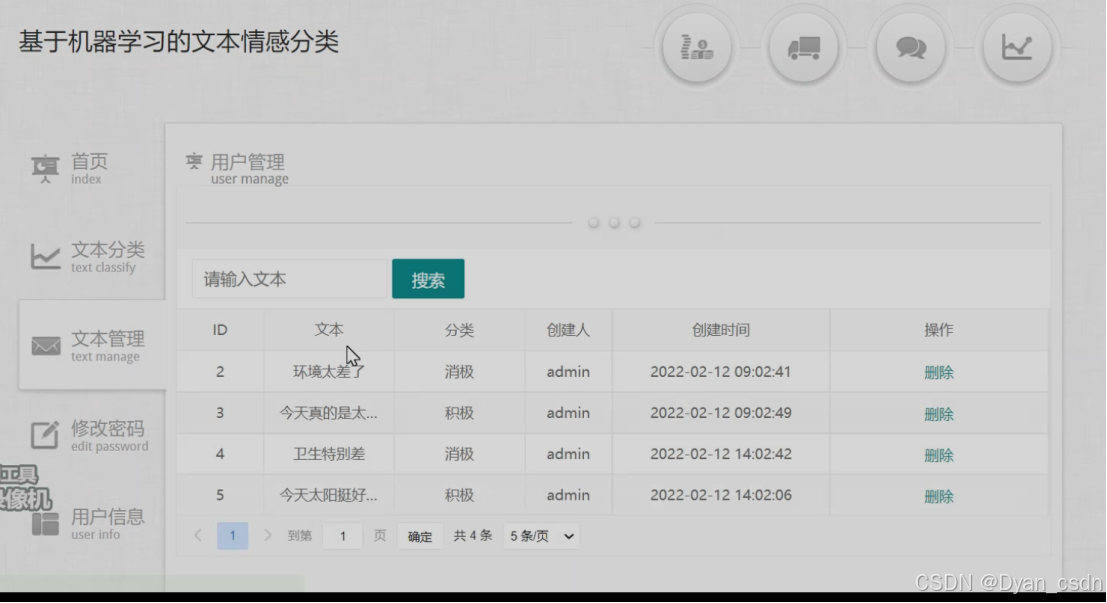 系统简介:功能模块最为主要的是文本分类以及文本管理。文本分类模块中主要是通过文字输入来进行文本情感的检测运算。在文本分类模块中设计了文本对话框,在该文本框内输入信息点击分类可以实现对输入文字的校验过程,能够实现对文本的内容情况计算,并且得出结论。文本管理模块可以将文本分类中的相关内容进行完整的记录,在文本管理中会以列表的形式来进行展示工作,能够提供具体的文本输入内容,机器判断内容等。