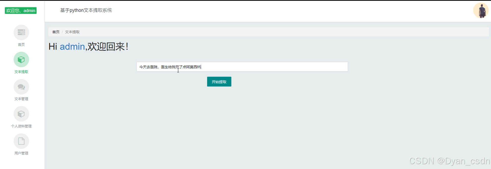 系统简介:前台:(1)用户可以匿名浏览网站,但不能使用系统中的其他功能,也不能进行文字提取。(2)用户注册与登录:用户们如果想在系统中使用全部的功能,需要经过一系列的有验证信息的注册,注册成功并登录后,用户可以使用所有的功能。(3)个人中心:用户可以在首页面进行对自己个人信息的查看,以及可以查看自己的历史评论和查询历史。(4)系统信息查看模块:用户可以在本可视化系统中查看系统信息。(5)文本提取模块:用户可以在本系统中输入文字进行药品名称的提取。(6)文本搜索:用户可以在系统通过不同的条件进行分类检索。