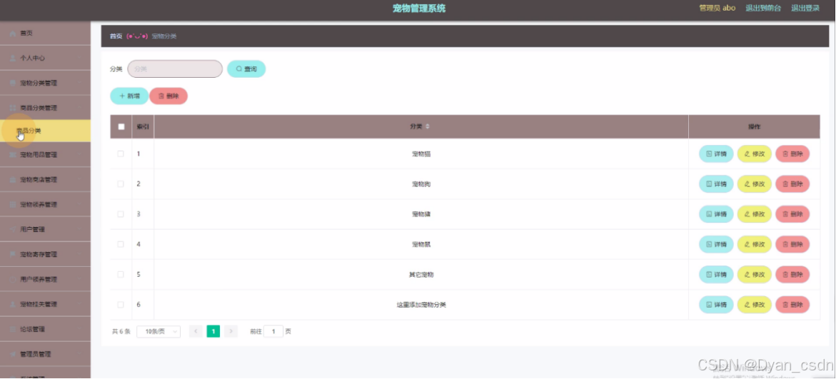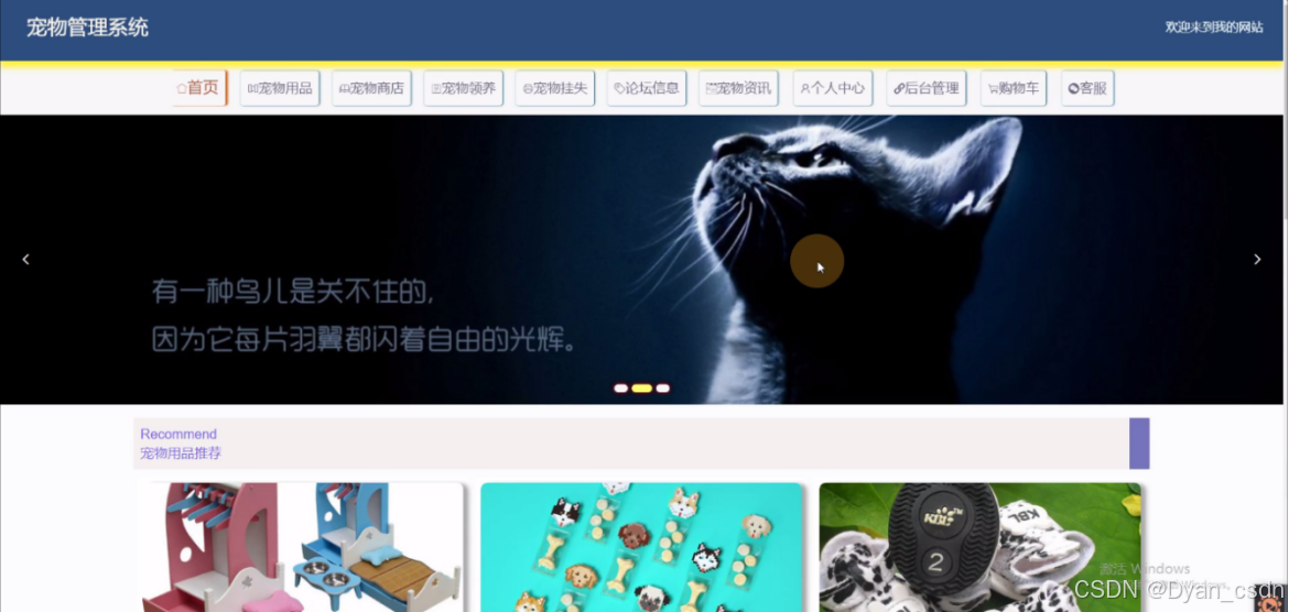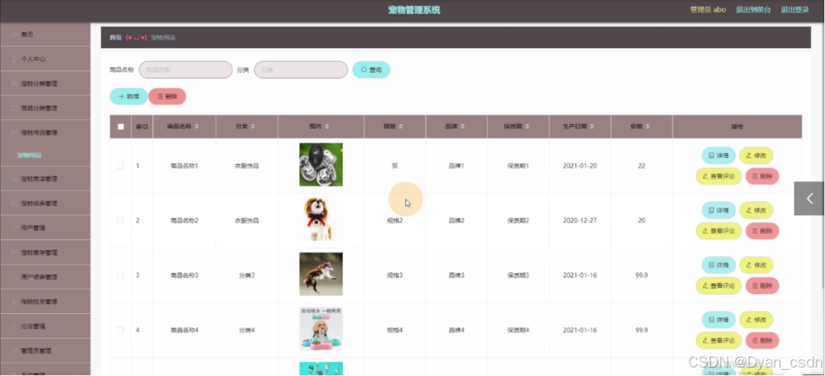 系统简介:宠物管理系统,在系统首页可以查看首页、宠物用品、宠物商店、宠物领养、宠物挂失、论坛信息、宠物资讯、个人中心、后台管理、购物车、客服等内容。 登录、用户注册,在用户注册页面可以查看用户名、密码、姓名、手机等详细内容进行登录、用户注册。宠物用品,在宠物用品页面通过填写商品名称、分类、图片、规格、品牌、保质期、生产日期、价格等信息进行立即购买。管理员登录,通过填写注册时输入的用户名、密码、角色进行登录。