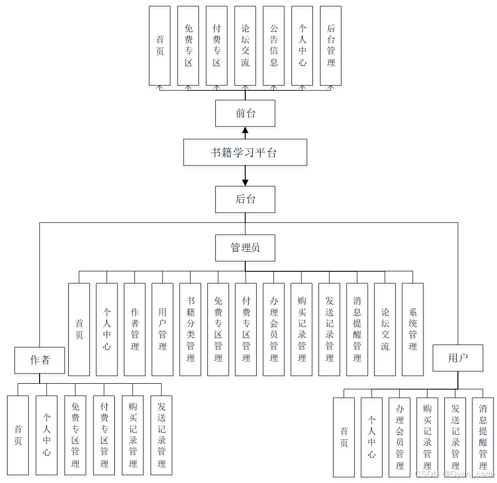 系统简介:理员使用本平台涉到的功能主要有首页、个人中心、作者管理、用户管理、书籍分类管理、免费专区管理、付费专区管理、办理会员管理、购买记录管理、发送记录管理、消息提醒管理、论坛交流、系统管理等功能。作者的功能主要包括首页、个人中心、免费专区管理、付费专区管理、购买记录管理、发送记录管理等功能。用户主要包括首页、个人中心、办理会员管理、购买记录管理、发送记录管理、消息提醒管理等功能。