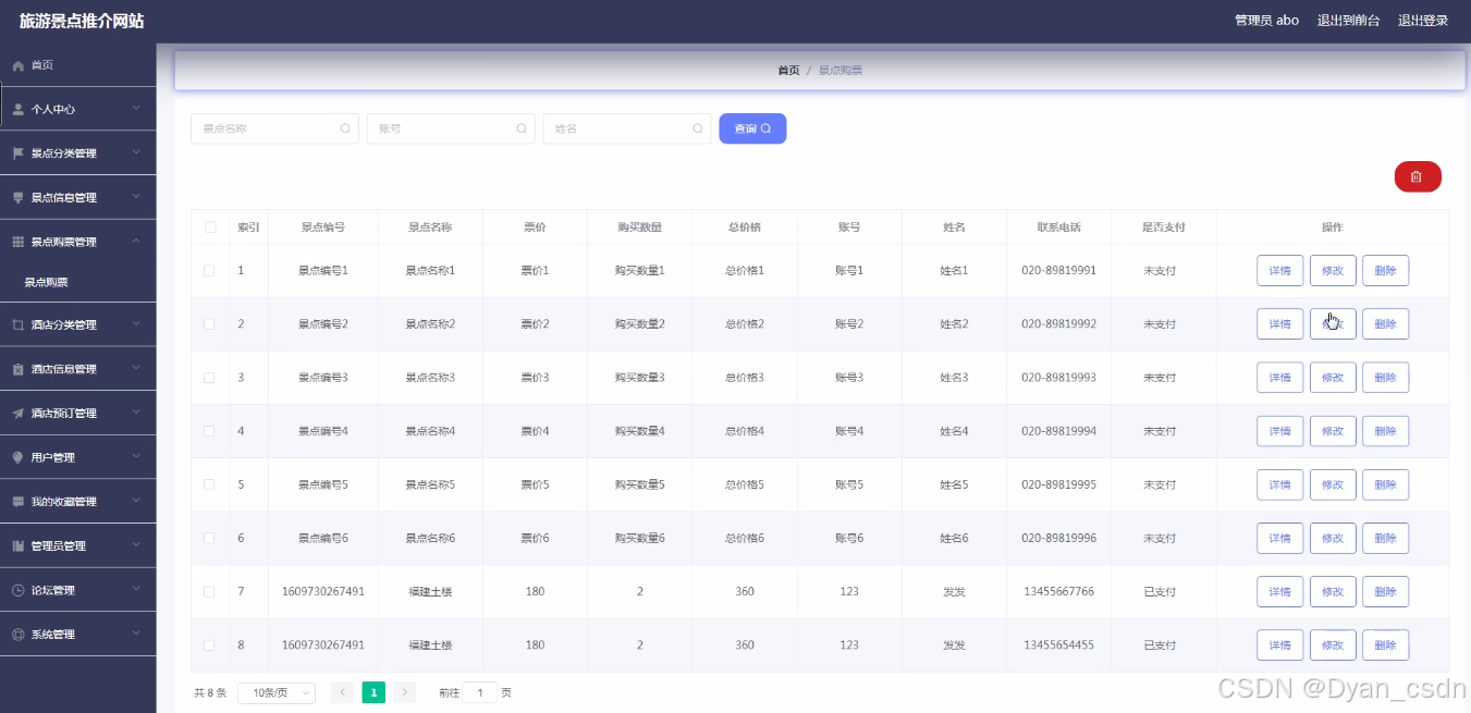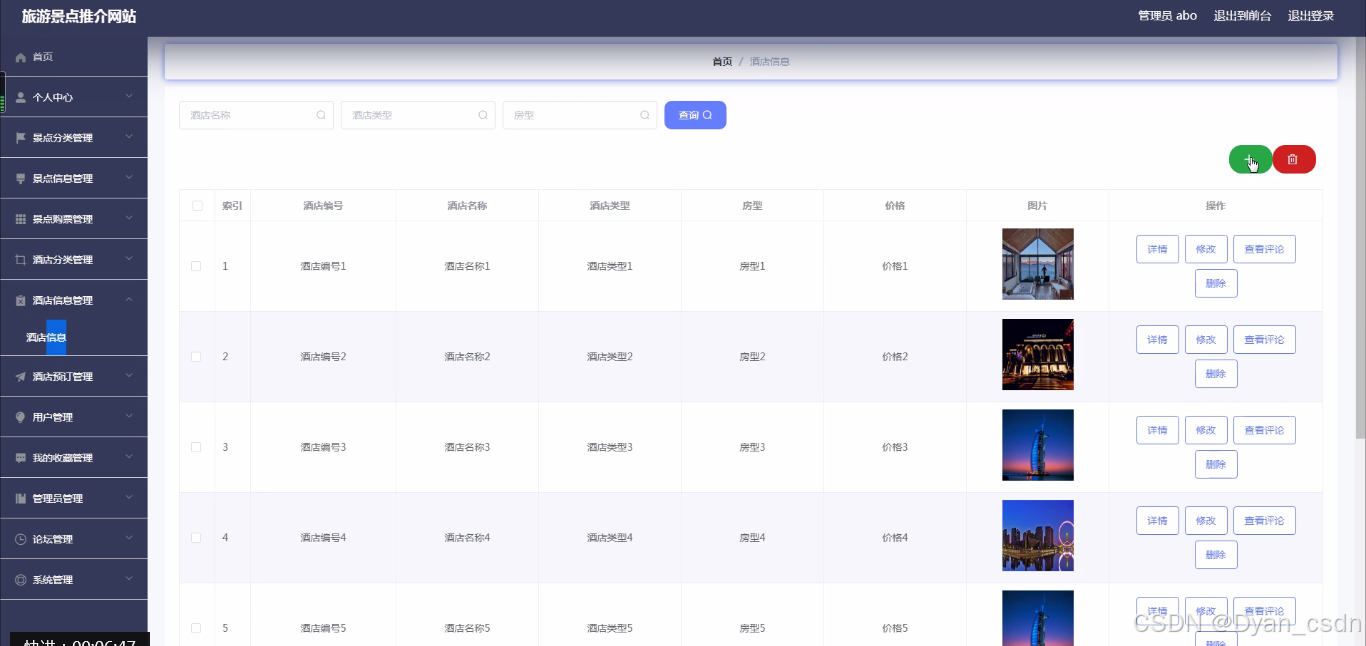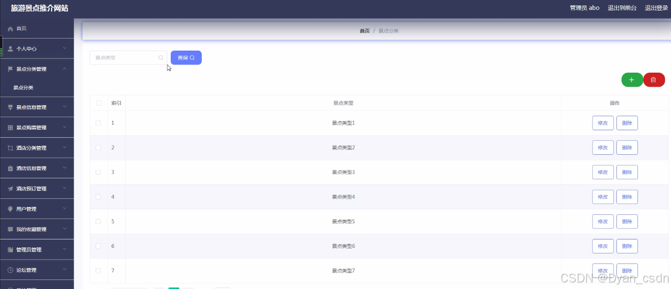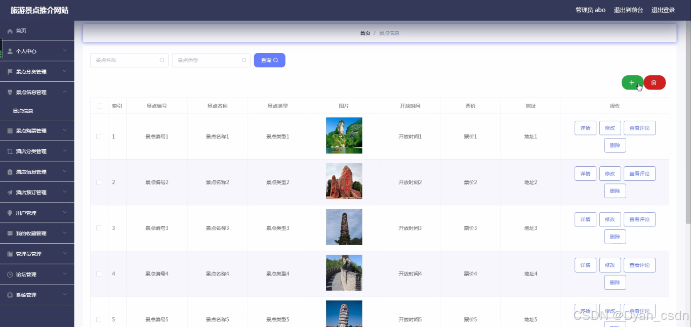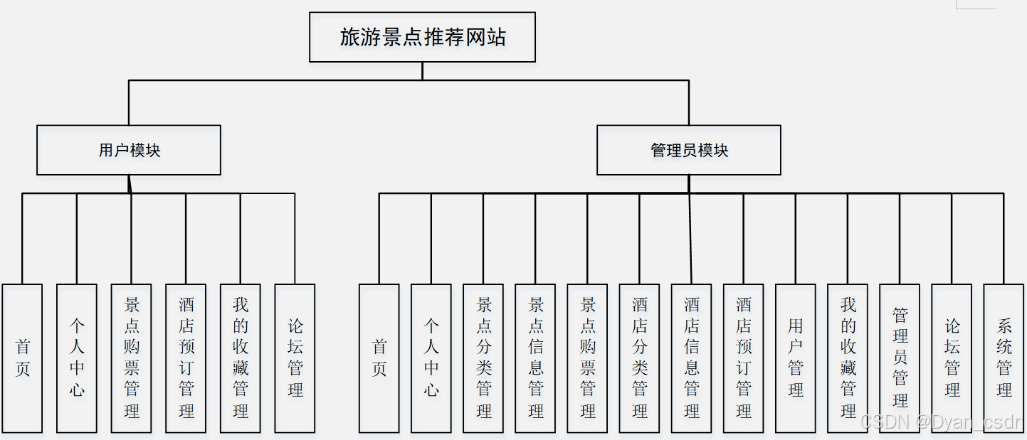 系统简介:(1)管理员功能要求:可以管理首页、个人中心、景点分类管理、景点信息管理、景点购票管理、酒店分类管理、酒店信息管理、酒店预订管理、用户管理、我的收藏管理、管理员管理、论坛管理、系统管理等功能模块。
