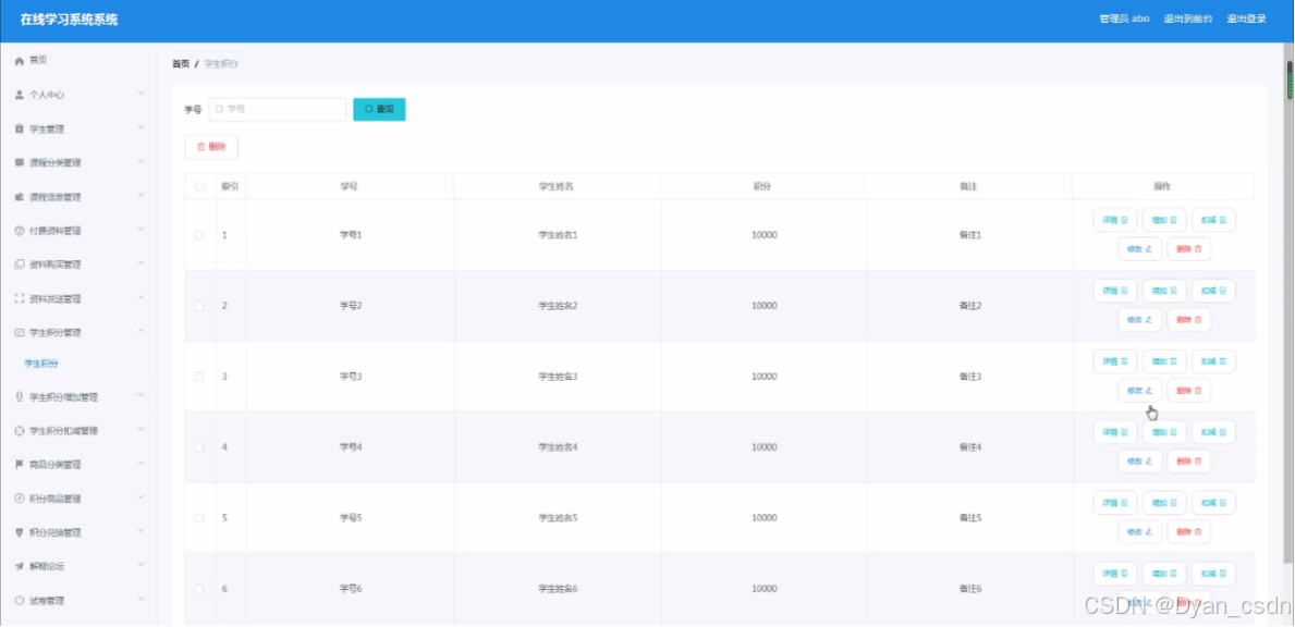 (1)管理员模块:系统中的核心用户是管理员,管理员登录后,通过管理员功能来管理后台系统。主要功能有:首页、个人中心、学生管理、课程分类管理、课程信息管理、付费资料管理、资料购买管理、资料发送管理、学生积分管理、学生积分增加管理、学生积分扣减管理、商品分类管理、积分商品管理、积分兑换管理、解疑论坛、试卷管理、留言板管理、试题管理、系统管理、考试管理等功能。学生:首页、个人中心、资料购买管理、资料发送管理、学生积分管理、学生积分增加管理、学生积分扣减管理、积分兑换管理、我的收藏管理、考试管理等功能。