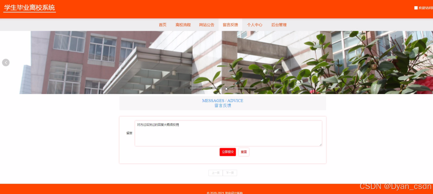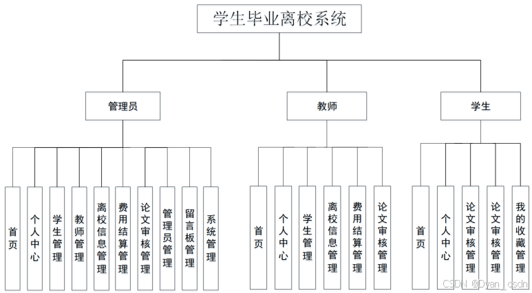 系统简介:学生进入系统可以查看首页、个人中心、费用结算管理、论文审核管理、我的收藏管理等操作。管理员登陆后,主要功能模块包括首页、个人中心、学生管理、教师管理、离校信息管理、费用结算管理、论文审核管理、管理员管理、留言板管理、系统管理等功能。