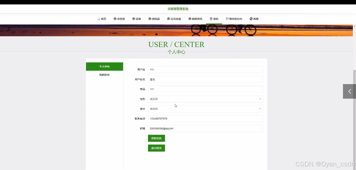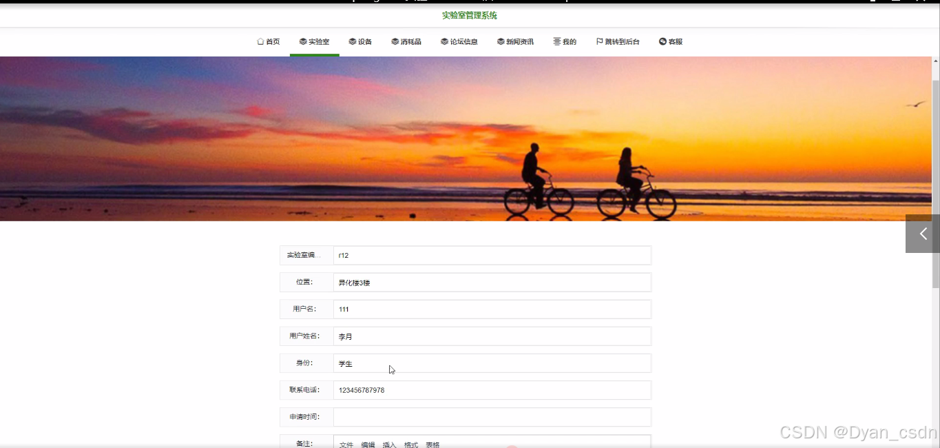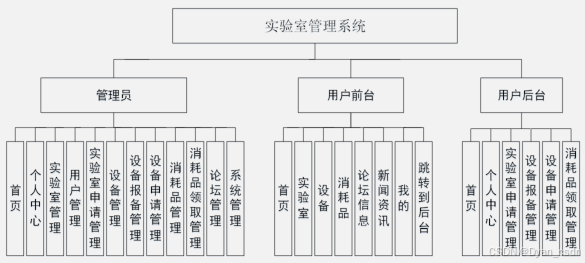 2)用户前台:首页、实验室、设备、消耗品、论坛信息、新闻资讯、我的、跳转到后台等相应操作;