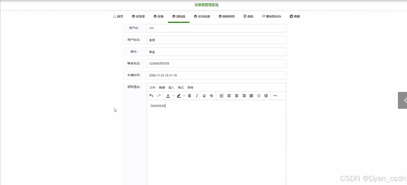 3)用户后台:首页、个人中心、实验室申请管理、设备报备管理、设备申请管理、消耗品领取管理等相应操作;
