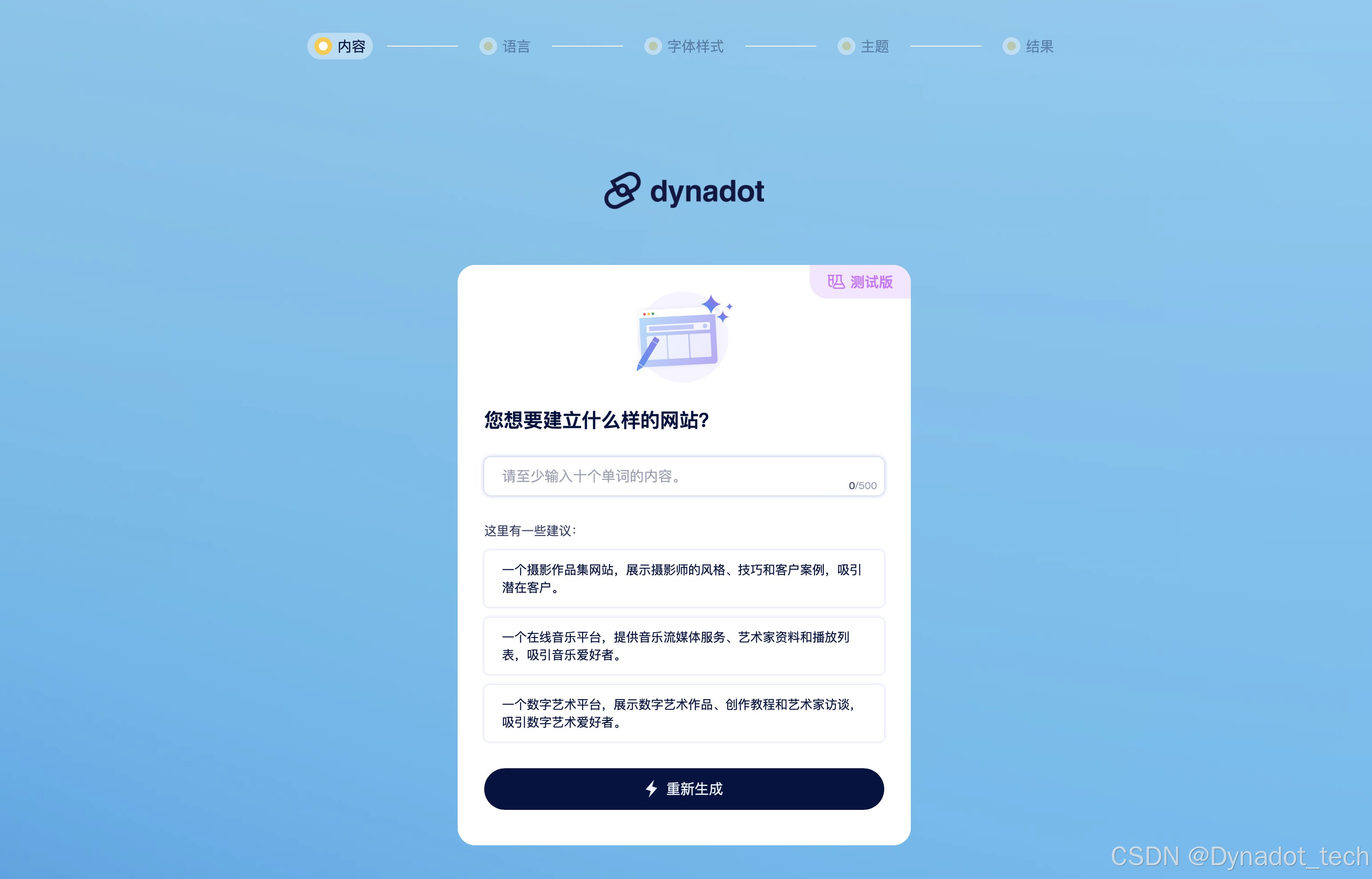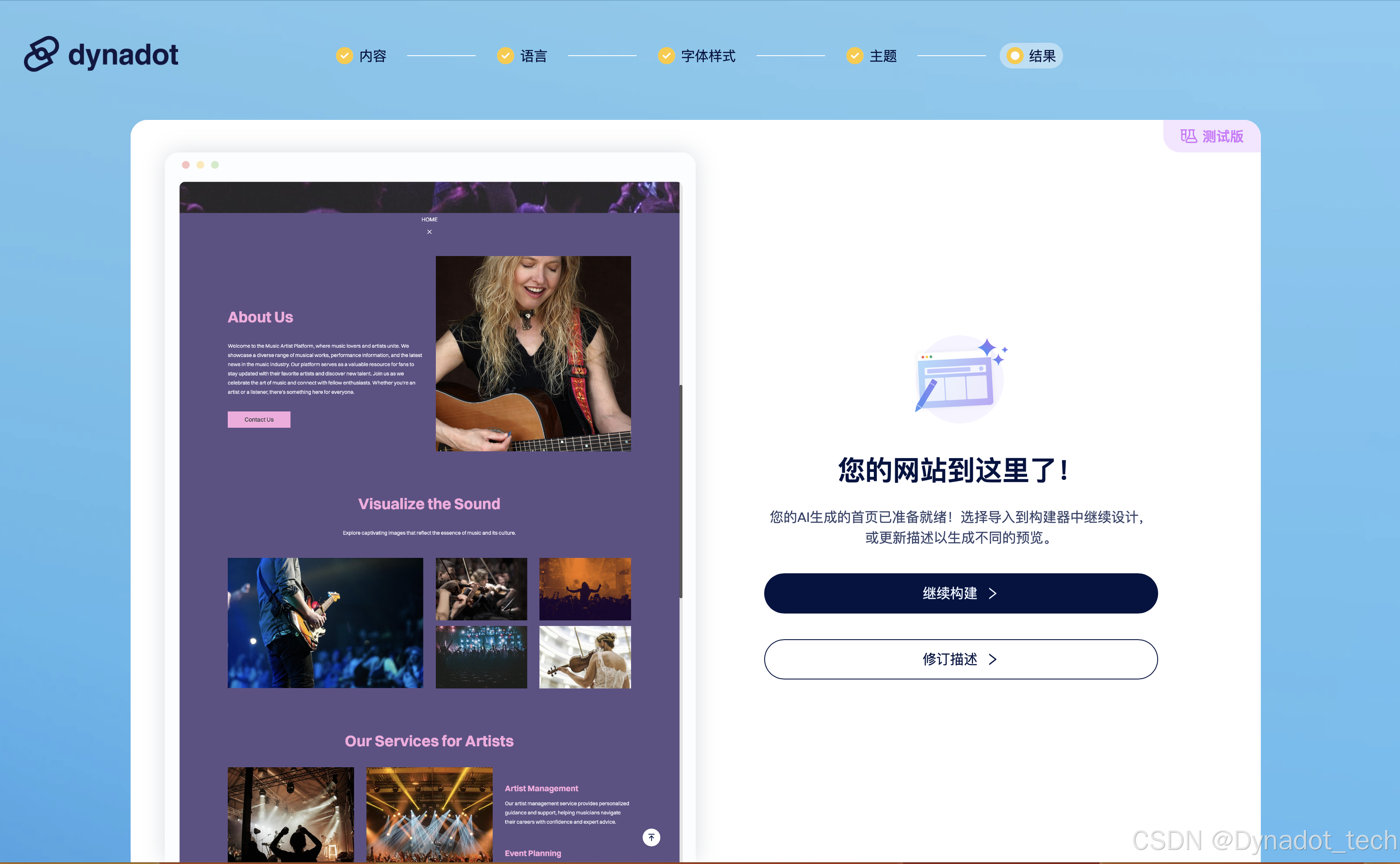 Dynadot的AI Sitebuilder利用人工智能技术,无需编码,根据您的描述自动生成网站。即使是非技术用户,也能通过AI Sitebuilder创建专业网站。随着不断学习与改进,AI Sitebuilder功能将会更加智能,为您提供更丰富和灵活的建站体验。