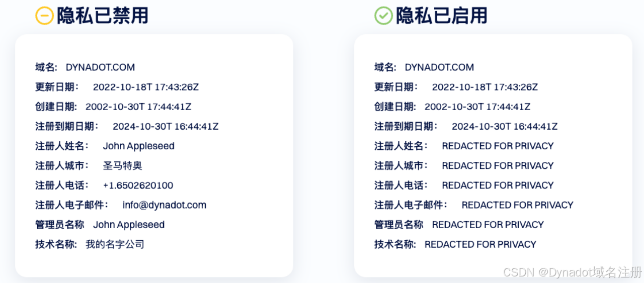 如图所示,使用whois查询域名信息时,是否启用域名隐私保护将得到不一样的查询结果: