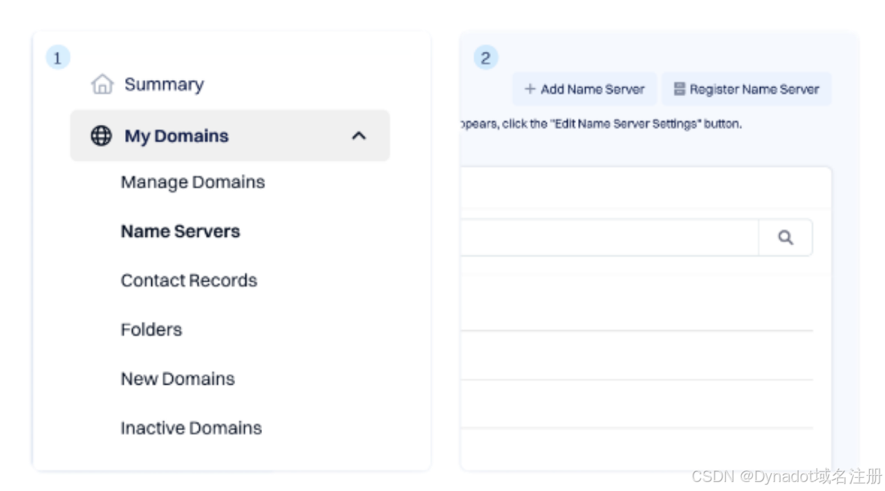 2.点击“+ 添加域名服务器”按钮将你的主机提供商的域名服务器添加到你的账户中,或者通过点击“注册域名服务器”按钮并添加你的主机名和IP地址来注册自己的域名服务器。