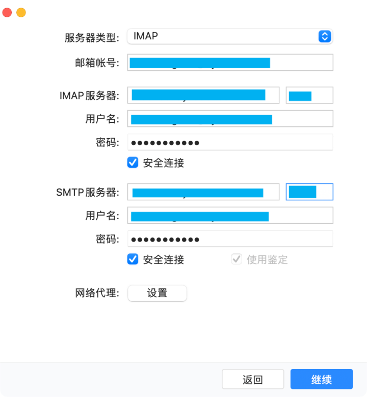 在跳转到配置界面后,输入IMAP与SMTP的服务器地址和端口信息后,点击继续,验证邮箱地址与密码。(注意,此时的密码会默认为邮箱密码,请更改为两种协议的对应密码。)