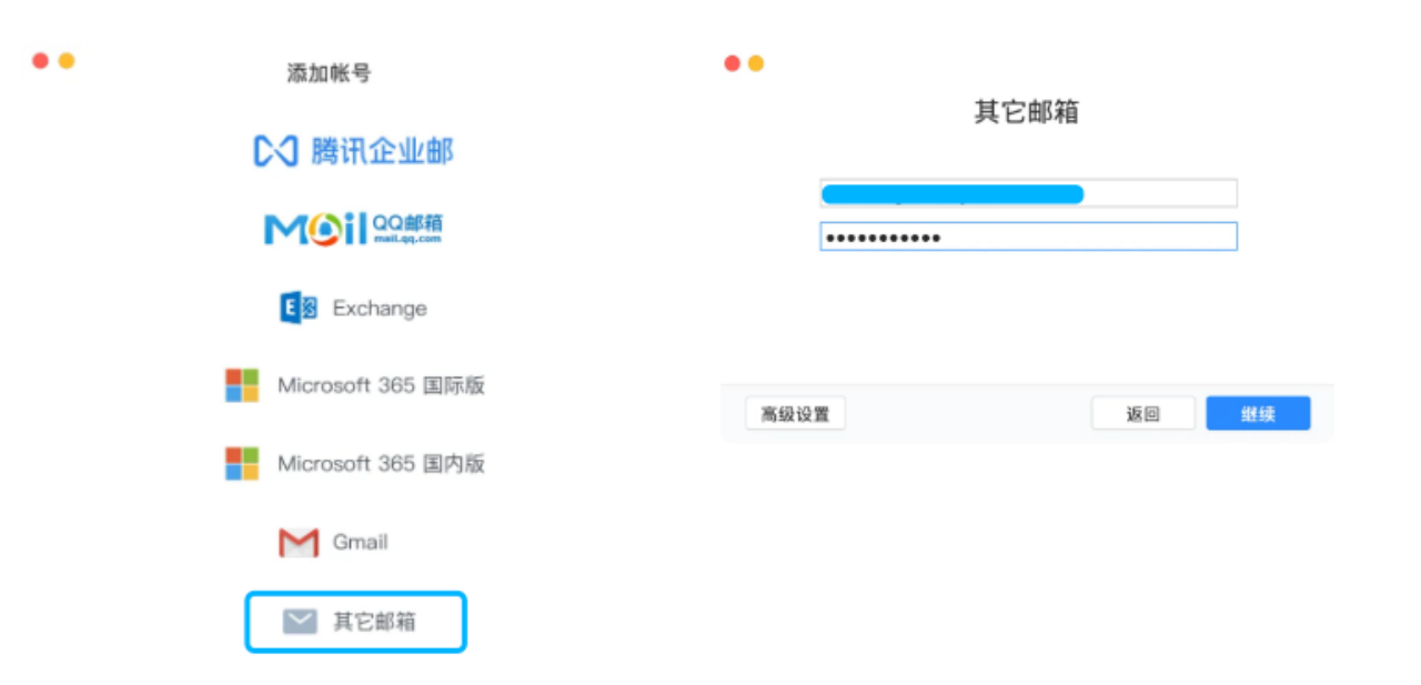 在获得并设置完成远程连接信息后,打开Foxmail客户端,在添加账号页面选择其他邮箱,并填写邮箱地址与密码。