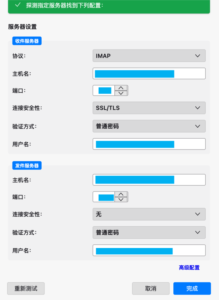 不过,由于域名邮箱的配置并不常见,您可能会遇到Thunderbird无法找到邮件帐户设置的状况,此时,需要您手动输入配置,并自行选择使用POP或是IMAP。服务器地址和端口信息后,点击继续,验证邮箱地址与密码。(注意,此时的密码会默认为邮箱密码,请更改为两种协议的对应密码。),随后点击重新测试,完成后的设置如下图所示: