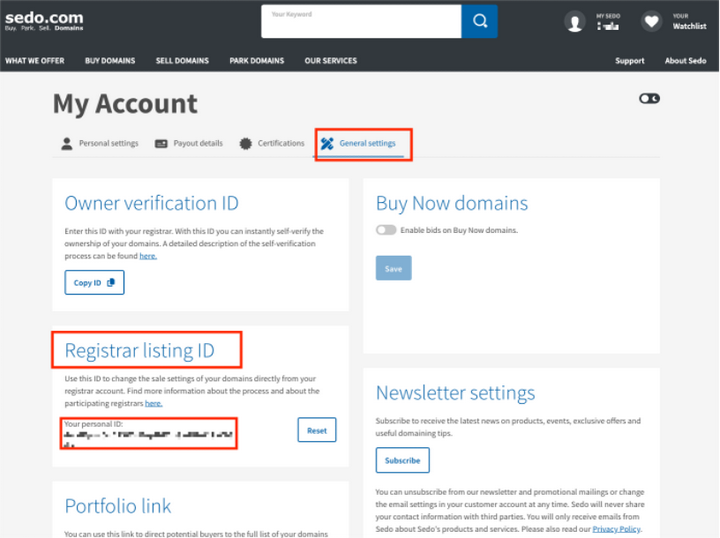 登录您的Sedo账户,找到listing-ID;(不清楚listing-ID可以点击帮助文档) 即:界面头像My Sedo > 列表找到My Account > Account Settings > General settings >Registrar Listing ID。