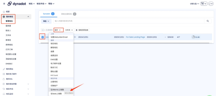 登录Dynadot账户,选择左列“我的域名”,点击“管理域名”,选中域名旁边的方框,点击“操作”,选择其中的“在Afternic上销售”。(请注意:您在Dynadot注册的域名除非符合转移条件,否则无法在Afternic列出。在过去60天内注册或转入的域名将不符合资格。)