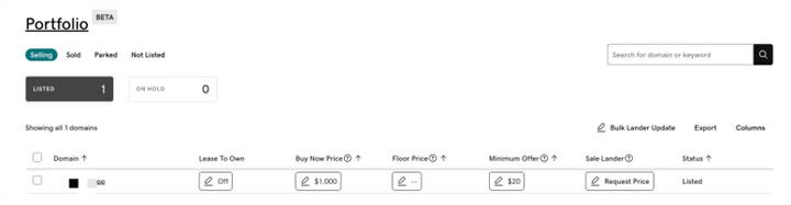 同时,在Afternic的后台也能搜索到对应的域名。如果想要设置最低价格等等操作,需要进入到Afternic的后台管理界面进行修改。