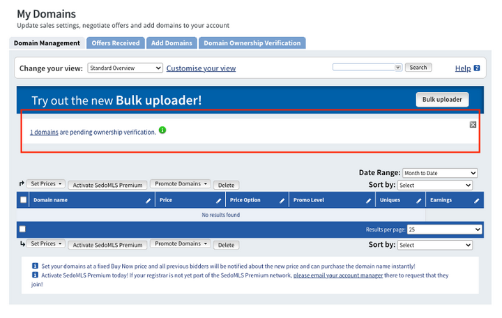 保存设置后,Sedo核实完域名所有权后,才能将域名上架到Sedo的域名市场中。