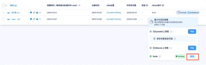 点击该图标,选择Sedo中的“编辑”按钮,对销售价格进行修改。