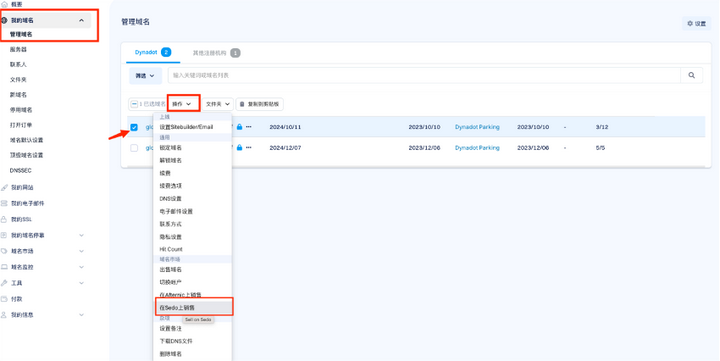 选择想要在Sedo出售的域名,点击“操作”下拉按钮,选择“在Sedo上销售”。