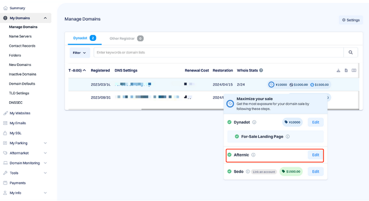 通过将 Sedo 和 Afternic 直接与您的 Dynadot 账户进行集成,您就可以在 Dynadot 平台上同步管理多个域名市场的销售。无需跨平台,您的域名就可以覆盖更多潜在买家,有效地提高成交率。