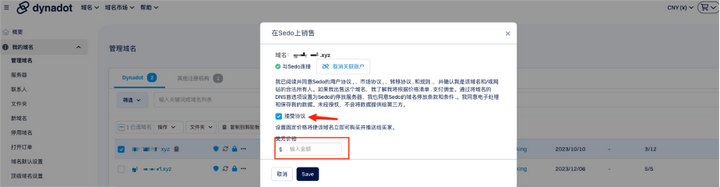 再次选中该域名,在“操作”下拉框中选择“在Sedo上销售”; 出现弹框后,选择接受协议,设定一口价价格(币种为美元,与Afternic相同,在此处,Sedo默认该域名仅支持一口价交易),点击保存即可。