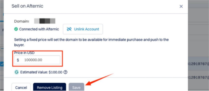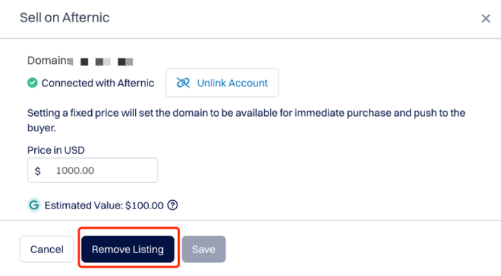 如果您想要移除在Afternic的销售, 请点击售后市场指示器 - Afternic 编辑 - 点击移除列表,并登录您的Afternic账户,确认取消同步已经生效。