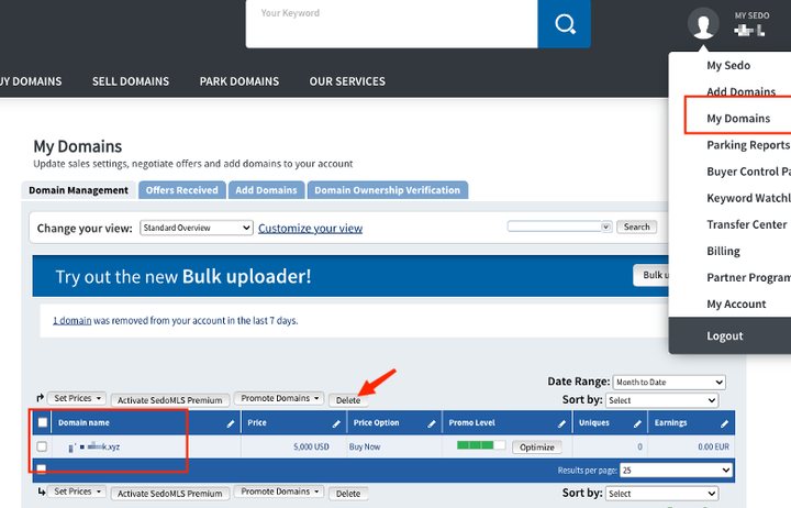 上一步骤完成后,进入Sedo账户,点击“My domains”,选中想要取消出售的域名并点击“delete”,即可取消域名在Sedo的销售。