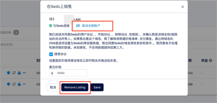 此外,如果取消在Sedo网络上的销售,可以点击“取消关联账户”或“Remove listing”。